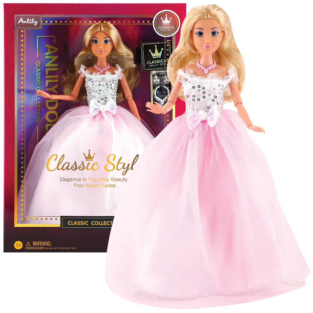 Módní panenka ve společenských šatech je dokonalým dárkem, který rozjasní dětské herní chvíle i sbírky milovníků panenek. Její dlouhé růžovobílé šaty zaručeně upoutají pozornost a přinesou mnoho radosti při každé hře nebo vystavení.