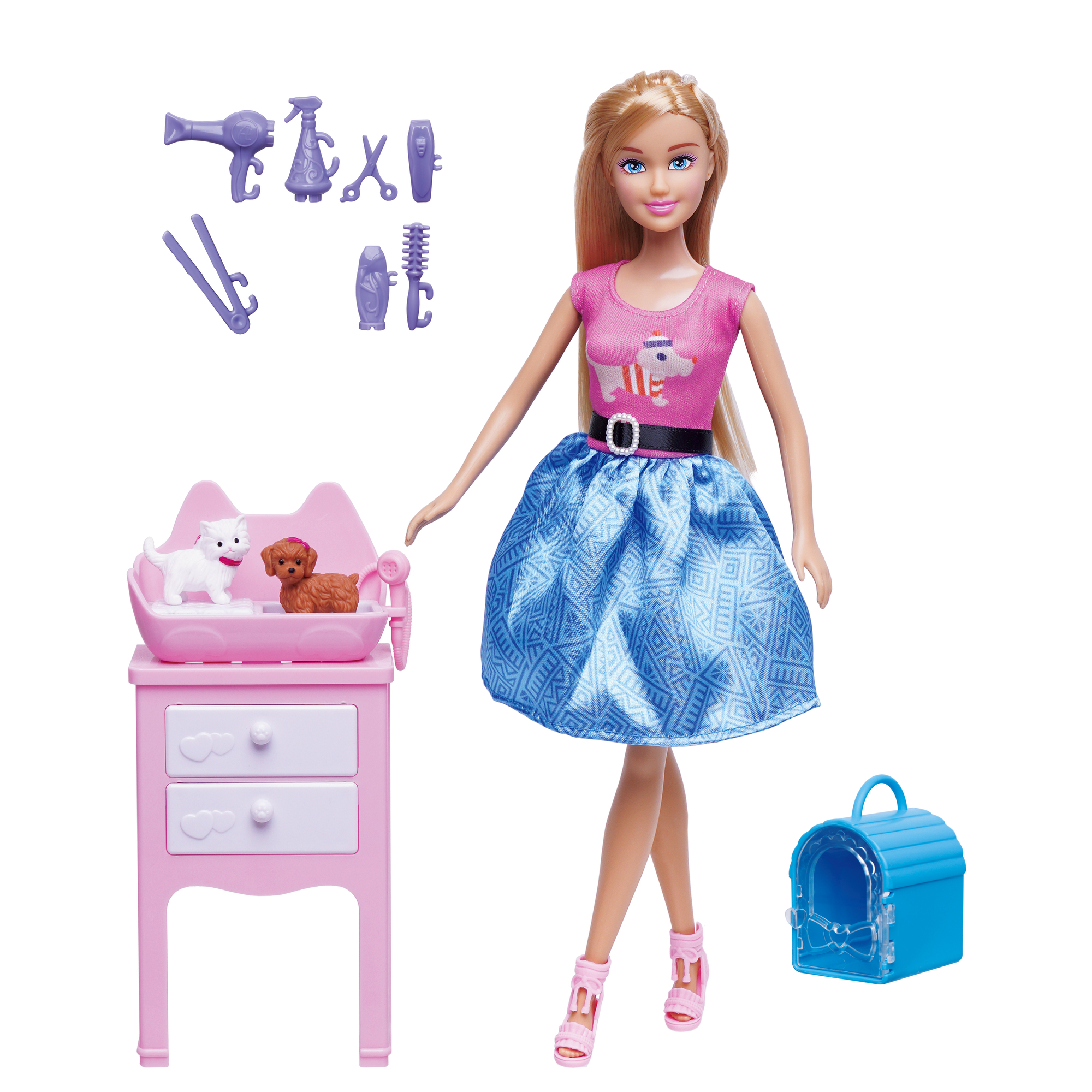 Panenka s pejskem a kočičkou set. Velikost 30 cm. Součástí pejsek, kočička, vanička se skříňkou, přenoska, příslušenství na koupání. číst celé