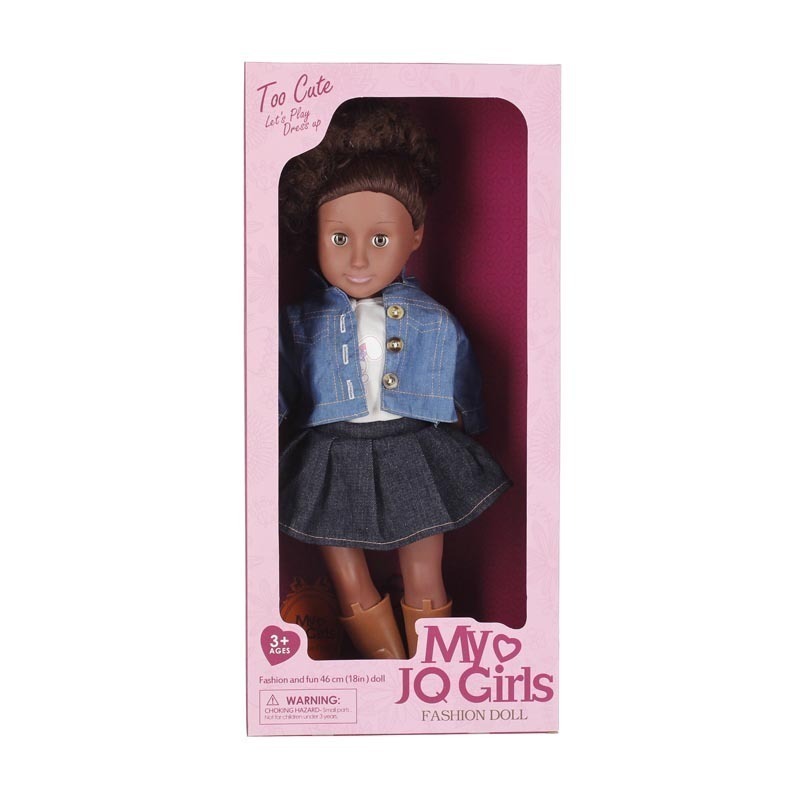 Duża lalka w spódnicy firmy EURO-TRADE. Posiada wyraźnie zaznaczone elementy fizjonomii twarzy (brwi, rzęsy, pomalowane usta). Długie włosy lalki są kręcone. Możemy ćwiczyć tworzenie podstawowych fryzur. Zabawka posiada zamykane oczy (wystarczy położyć ją poziomo). Ubrana w modny outfit (spódnica i dżinsowa koszula). Na jej nogach znajdują się buty. Możemy poruszać głową, nogami i rękami lalki.Wymiary opakowania: 24x12x51cmWysokość lalki: 46cmWiek: 3+