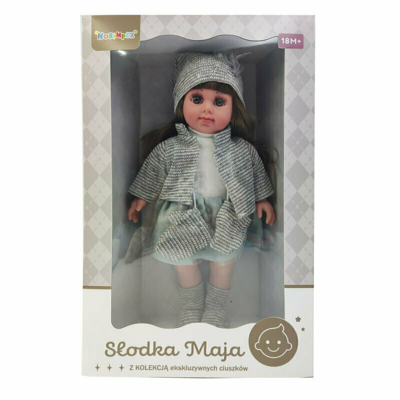 Przedstawiamy niezwykle uroczą lalkę o imieniu Słodka Maja z kolekcją ekskluzywnych ciuszków. Laleczka odznacza się ślicznymi, dużymi oczkami, uśmiechniętą buzią, delikatnymi rumieńcami na policzkach oraz długimi, brązowymi włosami, które można stylizować, tworząc wspaniałe fryzury. Słodka Maja ubrana jest w zimowy, niebiesko-szary strój, składający się z sukienki, kurteczki, czapeczki oraz ciepłych skarpetek. Zabawa i opieka nad laleczką stanowi doskonały sposób na rozwijanie empatii i wyobraźni dziecka oraz naukę odpowiedzialności i troski o drugą osobę. Słodka Maja została umieszczona w opakowaniu z okienkiem i rączką.