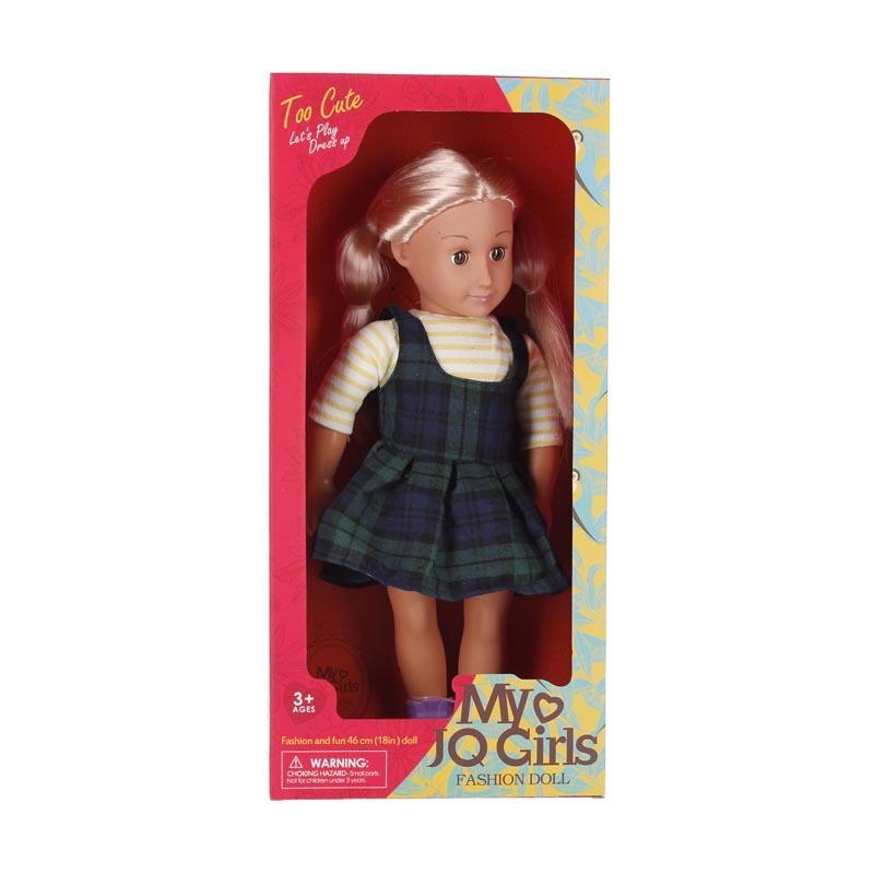 Duża lalka w sukience firmy EURO-TRADE. Posiada wyraźnie zaznaczone elementy fizjonomii twarzy (brwi, rzęsy, pomalowane usta). Długie włosy są spięte gumkami. Możemy ćwiczyć tworzenie podstawowych fryzur na laleczce. Zabawka posiada zamykane oczy (wystarczy położyć ją poziomo). Ubrana w modny outfit. Na nogach znajdują się buty. Możemy poruszać główką, nogami i rękami zabawki.Wymiary opakowania: 24x12x51cmWysokość lalki: 40cmWiek: 3+