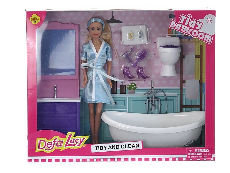 Zestaw lalka o wielkości 29 cm z akcesoriami. Lalka ubrana jest w błękitny szlafrok i opaskę na włosy.W zestawie znajduje się wyposażenie łazienki: wanna, sedes, umywalka z lustrem, akcesoria. Nie wymaga zasilania bateriami. Wiek: 3+
