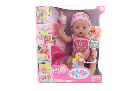 Panenka - holčička, ve velikosti 43 cm s mechanickými funkcemi, které fungují bez použití baterií! Panenka roní slzy (po stištění hrudi), pije vodu z lahvičky, jí speciální kašičku, kaká, zavírá oči, má nově řešenou pohyblivost kloubů, pro snadné oblékání. Má nově řešené tělíčko z příjemného materiálu a ukrytý pupíček pod „kůží“. Panenka je vodotěsná je možné ji koupat. Součástí balení je mnoho doplňků: bodýčko, čepička, talířek se lžičkou, porce kašičky, lahvička, nočník, plenka, dudlík se sponkou, rodný list, náramek přátelství pro panenku a její malou maminku