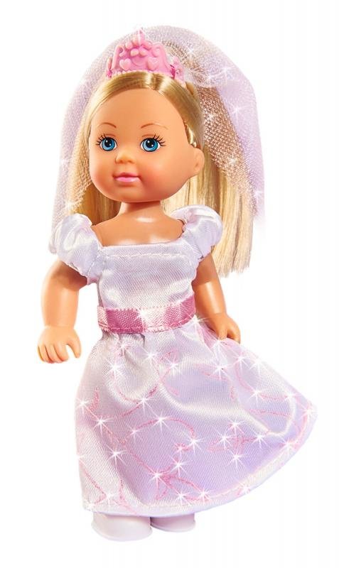 Panenka Evička jako nevěsta ve svatebních šatech, s tiárou se závojem a svatební kyticí. Velikost panenky 12 cm. číst celé