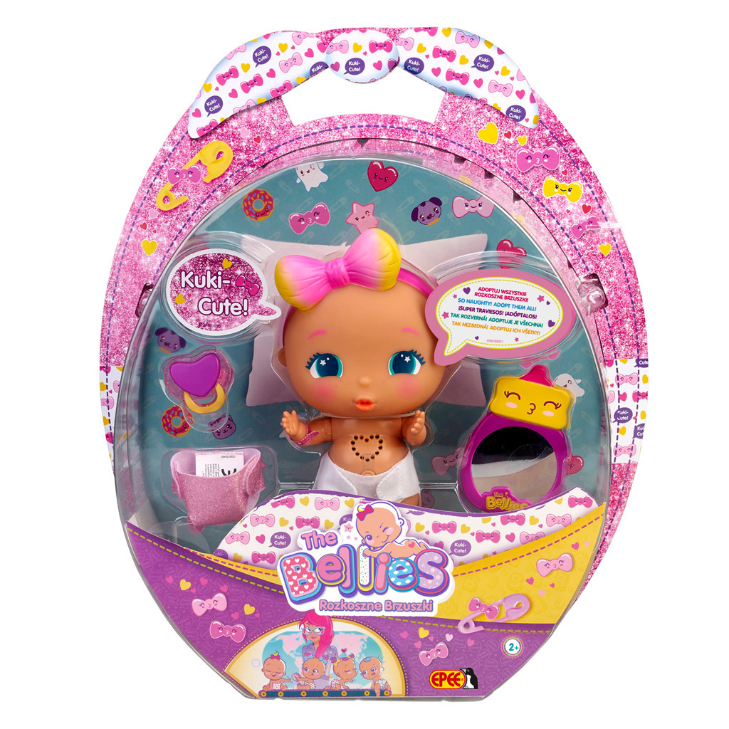 Roztomilá miminka Bellies hledají nový domov. Interaktivní miminka žvatlají a bije jim srdíčko. Každé má unikátní mateřské znaménko. Miminka Noni-No a Kuku-Cute mají unikátní třpytivé plínky a originální doplňky. Obsah balení: panenka, dudlík, bílá plenka, třpytivá plenka, láhev nebo lízátko, adopční listina. Assort 2: Noni-No a Kuki-Cute. Pro děti od 2let.