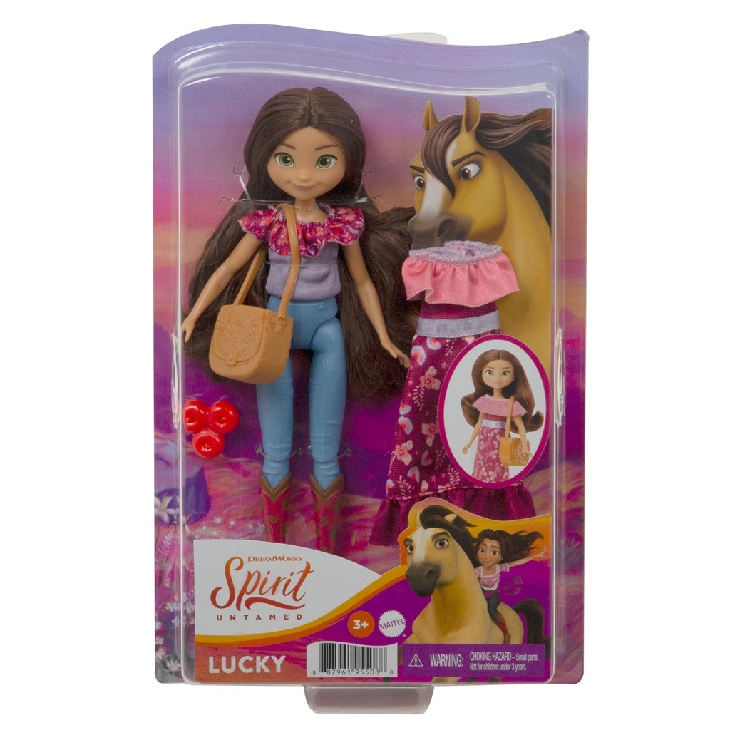 Buďte součástí všeho toho přátelství, statečnosti a dobrodružství s animovaným filmem Spirit od DreamWorks! Sortiment panenek a módních doplňků Spirit Happy Trails Doll & Fashion nabízí výběr z panenek Štístko, Abigail nebo Pru, každé oblečené v roztomilém typickém oblečení. Každá panenka je dodávána i s dalšími šaty, kabelkou a doplňky. Panenky jsou velké přibližně 17,78 cm a jsou vybaveny 7 pohyblivými klouby pro zábavu při pózování a hraní. Každá se prodává samostatně, v závislosti na dostupnosti. Barvy a dekorace se mohou lišit.
