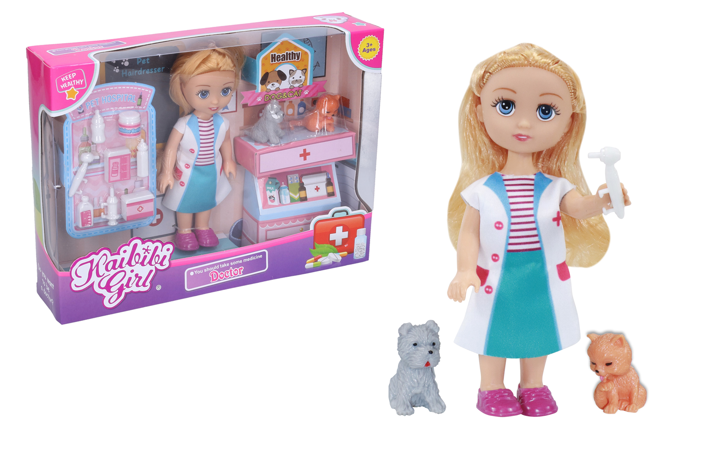 Panenka veterinářka set. Velikost panenky 15 cm. Obsah balení - panenka, pejsek, kočička, lékařské nástroje.