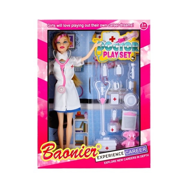 Panenka Doktorka Lalka od Mega Creative. Obsah balení je Panenka v oblečení, medvídek lékařské doplňky, lékařská sluchátka, karta pacienta, lékárnička, teploměr a jiné.. . Rozměry panenky jsou 9x30x3cm a rozměr balení je 25x33x5cm. Souprava je určena pro děti ve věku: 3+. číst celé