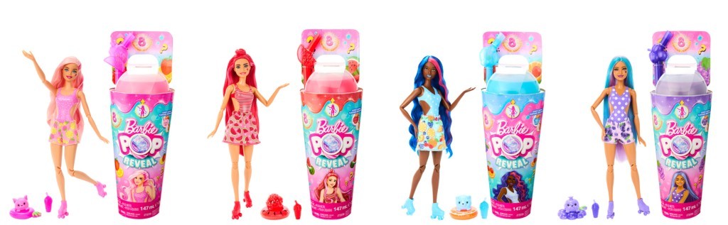 Panenka Barbie® Pop Reveal™ potěší děti tematikou šťavnatého ovoce a novým zážitkem při rozbalování, kdy pomocí slizu odhalí překvapení, mezi něž patří panenka Barbie® s vůní ovoce a kostky ledu, které při prasknutí odhalí další překvapení. Set obsahuje heboučké voňavé zvířátko, tematické doplňky a hru se změnou barev. Všechny čtyři panenky z edice Pop Reveal™ Šťavnaté ovoce se liší vzhledem, druhem ovoce a barevným provedením, a i s doplňky jsou skryté v limonádových kelímcích s víčkem. Panenky se prodávají zvlášť v závislosti na dostupnosti. Panenka nemůže stát samostatně. Barvy a provedení dekorací se mohou lišit.