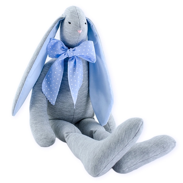 Králíček je z příjemného a měkkého materiálu s výraznou mašlí.
