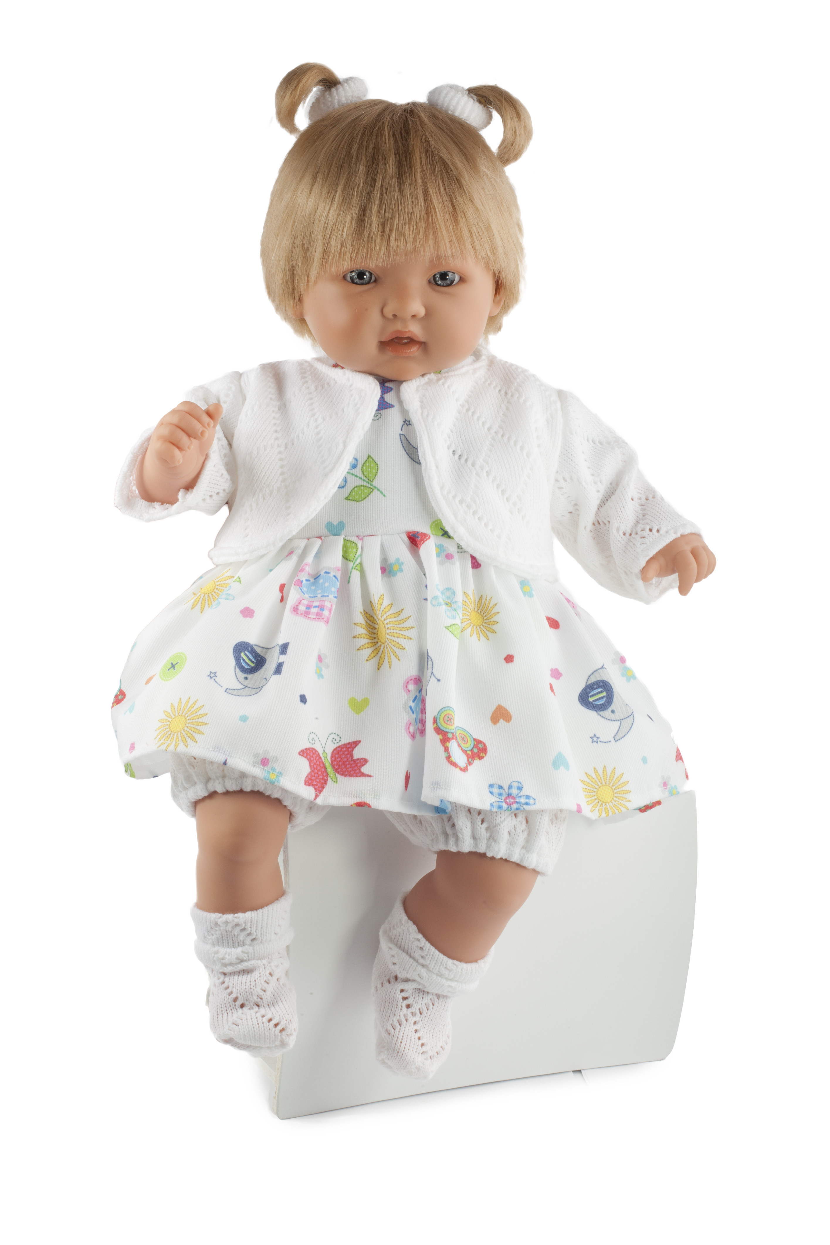 TYBER Paula blondýna v bílém plačící panenka s dudlíkem, vel. 45 cm