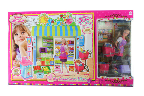 Supermarket s panenkou. Obsahuje konstrukci supermarketu (plast, karton), regály, pokladnu, nákupní košík, potraviny, doplňky a také panenku o výšce cca 29 cm. Rozměry supermarketu 38,7 x 37,6 x 47,2 cm. Obsahuje více než 50 dílků. Rozměry balení cca 67,5 x 41 x 11,5 cm. Věk 3+