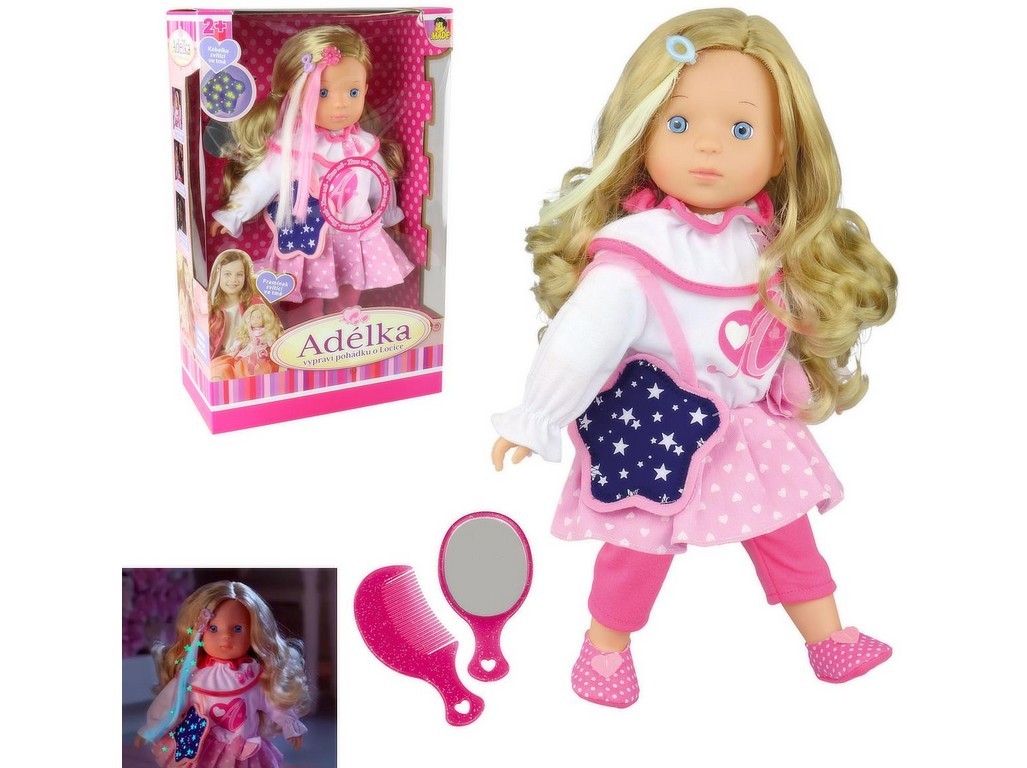 Adélka s pohádkou. Povídá českou pohádku o Locice. Adélka má připínací pramen vlasů, které svítí ve tmě - lze odepnout a připnout na vlasy holčičky.Kabelka ve tvaru hvězdy s hvězdičkami svítícími ve tmě.Příslušenství: Zrcátko, hřeben, barevné prameny vlasů se sponkami.Výška panenky: 40 cmČeský box