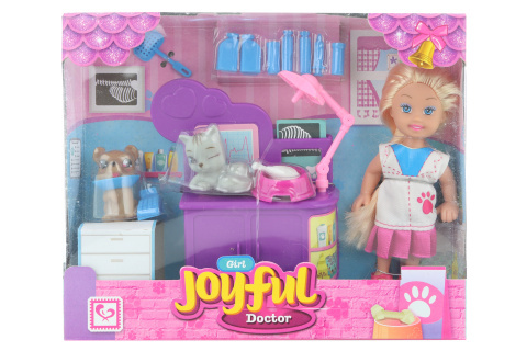 Panenka veterinářka s doplňky. Balení obsahuje panenku, kočičku, pejska, stolek a další doplňky. Rozměry balení cca 20,5 x 17 x 5 cm. Věk 3+ číst celé