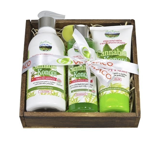 Sprchový gel Cannacare 200 ml - Sprchový gel je díky obsaženému přírodnímu oleji ideální k péči o pokožku suchou, postiženou ekzémy, lupénkou a dalšími formami dermatóz. Podporuje regeneraci, hydrataci a revitalizaci pokožky zatížené každodenními nepříznivými vlivy prostředí, vyrovnává její pH, napomáhá hojit kůži v místě opruzenin, popálenin, jizev a strií, ulevuje od bolesti svalů a kloubů. Vhodný pro každodenní péči o pokožku i vlasy pro muže i ženy. Neobsahuje parabeny ani silikony. Má antialergenní parfemaci.Krém na ruce a nohy CannaCare 200 ml - Jemná receptura krému s přírodním olejem pro účinnou péči o pokožku rukou a nohou. Obsahuje za studena lisovaný, přírodní olej, který příznivě působí na suchou a rozpraskanou pokožku a podporuje její regeneraci a hydrataci. Také napomáhá změkčovat ztvrdlou a zrohovatělou pokožku chodidel. Vhodný pro každodenní péči. Má antialergenní parfemaci, neobsahuje parabeny ani silikony.Mýdlo na ruce CannaCare 400 ml - Zvláčňující mýdlo s podílem čistého přírodního oleje jemně myje a pečuje o pokožku celého těla. Receptura s krémovými přísadami zvláčňuje pokožku a zanechává ji příjemně provoněnou a hebkou. Přírodní olej je vhodný pro péči o pokožku s atopickým ekzémem, lupénkou, akné a uhrovitostí.Čajová svíčkaFarmářská dřevěná bedýnka