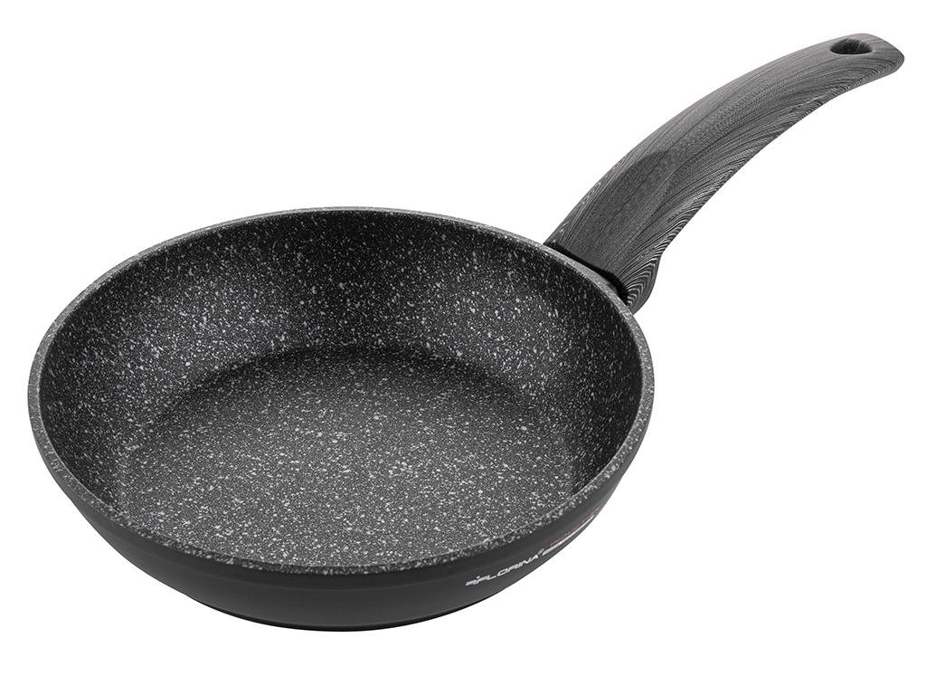 Pánev 18cm, Specifikace:- Materiál: hliník - tloušťka 3,0 mm - nepřilnavý povlak mramorového typu černé barvy skvrnité se stříbrnými částicemi- vnější černá matná rukojeť typu "soft touch" imitace dřeva - plná indukce. číst celé