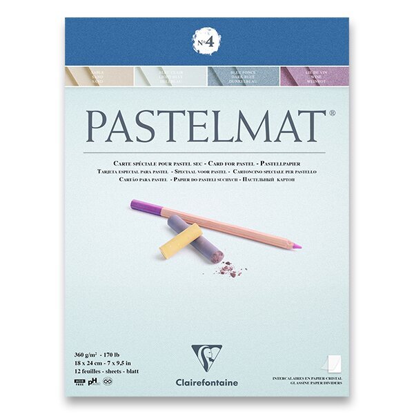 Blok Clairefontaine Pastelmat No.4 je profesionální papír speciálně vyvinutý pro práci s pastely. Pastel k tomuto papíru výborně přilne a není tedy nutný fixační prostředek. Papír pojme větší množství pastelu a umožňuje nanášení mnoha vrstev. Blok obsahuje 12 listů ve 4 odstínech s gramáží 360 g/m2.