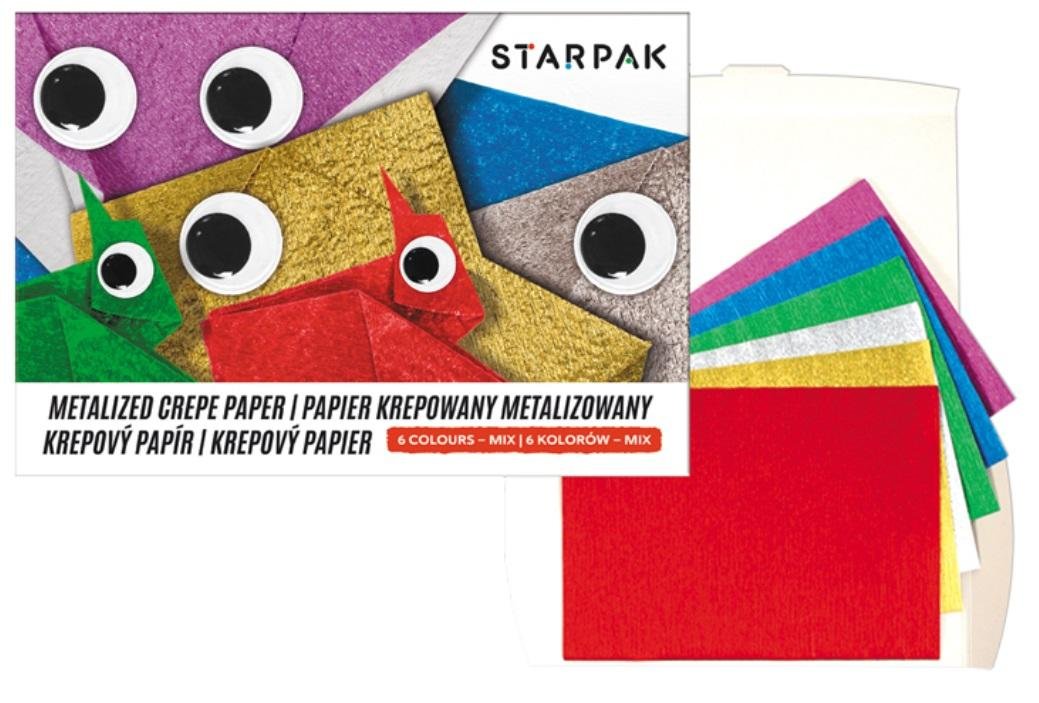 Papier krepowany z kolekcji Starpak. Papier metalizowany, w 6 kolorach, w rozmiarze C5. Idealny na lekcje plastyki i dla młodych artystów. Pakowany w teczkę.