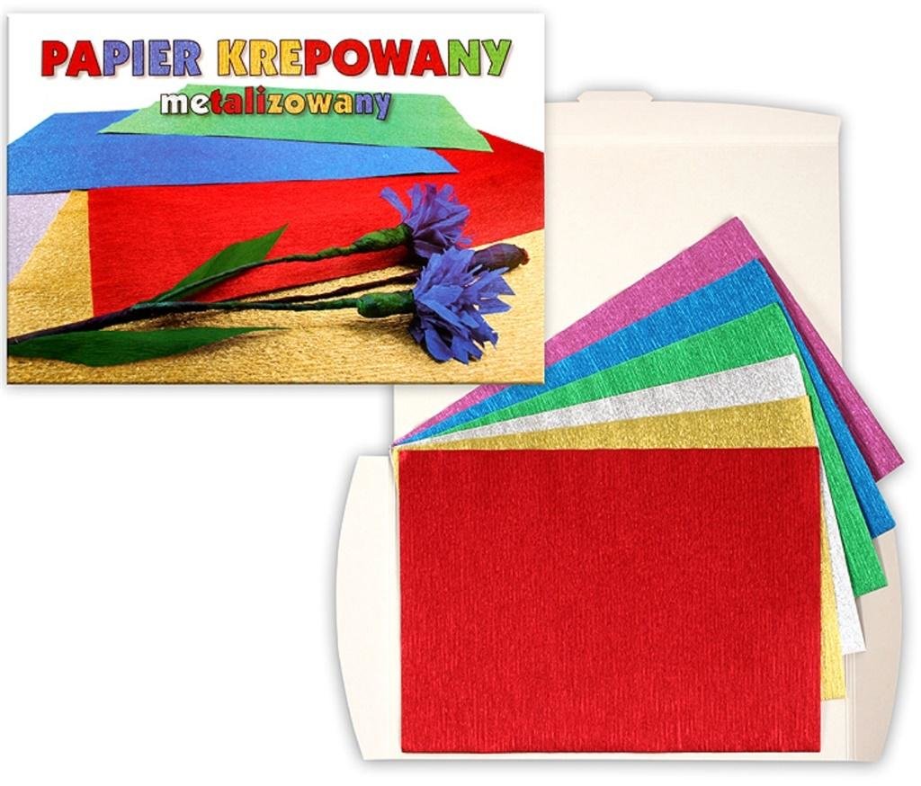 Papier krepowany z kolekcji Starpak. Papier metalizowany, w 6 kolorach, w rozmiarze C4. Idealny na lekcje plastyki i dla młodych artystów. Pakowany w teczkę.