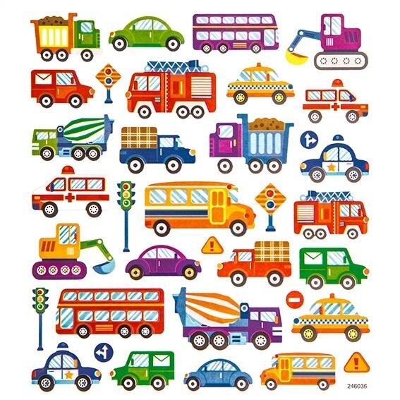 Foliowe naklejki z wizerunkami miejskich pojazdów takich jak taksówki, autobusy, straż pożarna i ambulans ale także samochody dostawcze czy koparki.