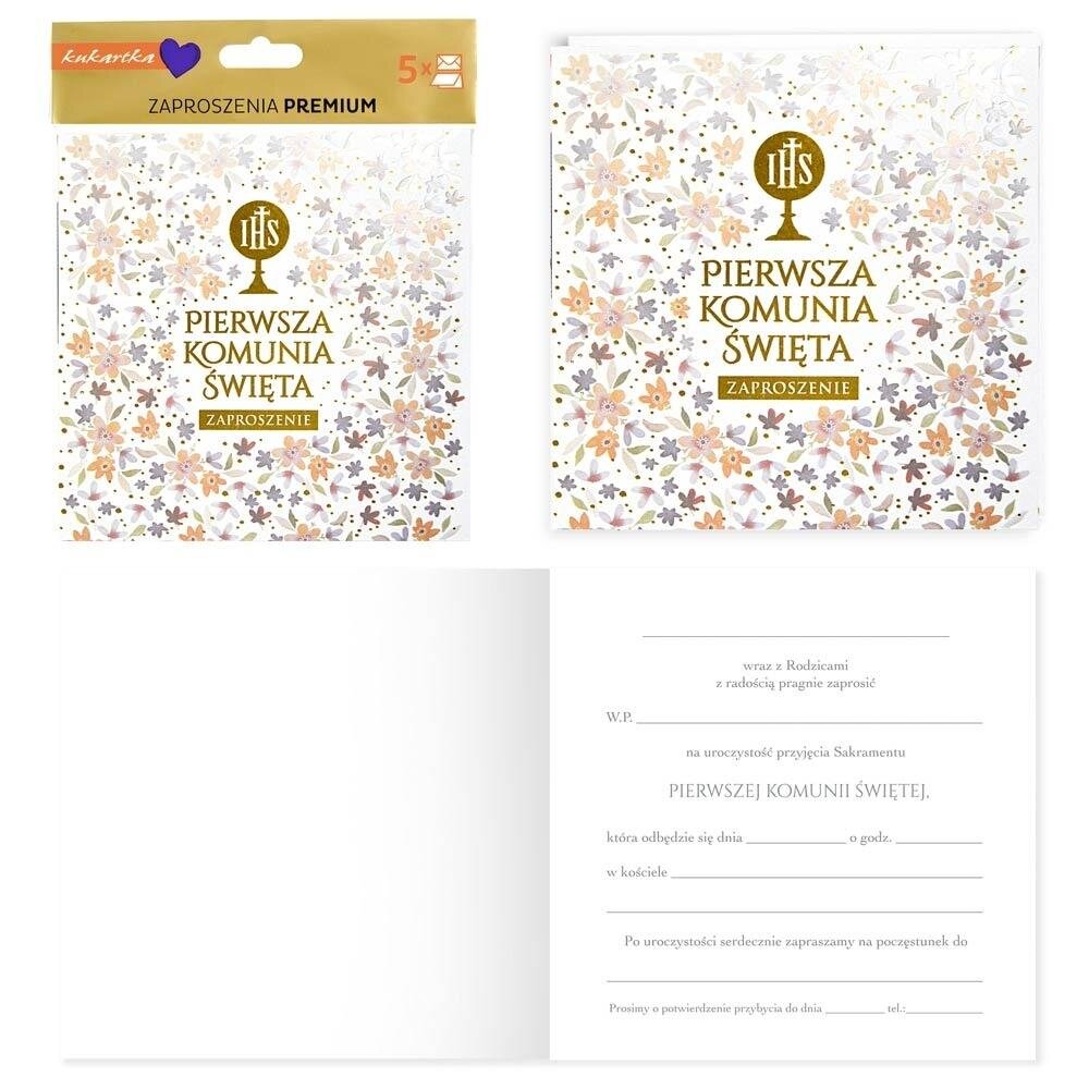 Zaproszenie na I Komunię Świętą Passion Moments Kukartka PMZ-135 Zaproszenie z serii Passion Moments PMZ to idealne połączenie stylu i przystępnej ceny. Zaproszenia PMZ drukowane są na satynowym, śnieżnobiałym papierze, a każde posiada przynajmniej dwa uszlachetnienia: złocenie lub srebrzenie, elementy z perłowej lub holograficznej folii itp. W opakowaniu znajduje się 5 zaproszeń i 5 dopasowanych do nich kopert. Cechy szczególne: opakowanie: woreczek zawierający 5 sztuk zaproszeń z kopertami, zdobienia: przynajmniej dwa: złocenie, srebrzenie, perłowa lub holograficzna folia, wymiary po złożeniu: 15,5 x 15,5 cm okazja: Komunia