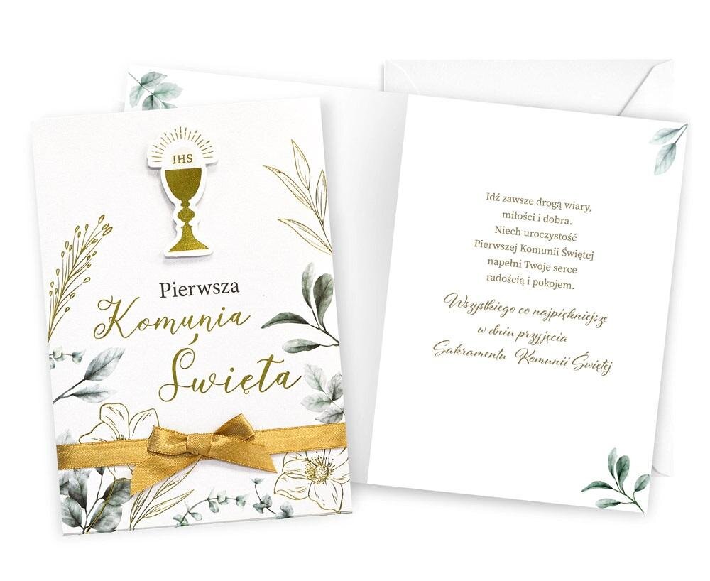 Kartka B6 z ozdobnej serii Dream Cards na Komunię - nieduża, ale robi wrażenie dzięki atrakcyjnej kolorystyce i ciekawym zdobieniom. To idealny wybór łączący przyjazną cenę z jakością. Cechy szczególne: wielkość: B6, 16.6 x 11.7 cm po złożeniu, koperta: w zestawie, biała zdobienia: różnorodne, bogate (w zależności od wzoru: przyklejane dekoracje, elementy biżuteryjne, odstawniki, metaliczne folie, tłoczenia itp.), okazja: Komunia