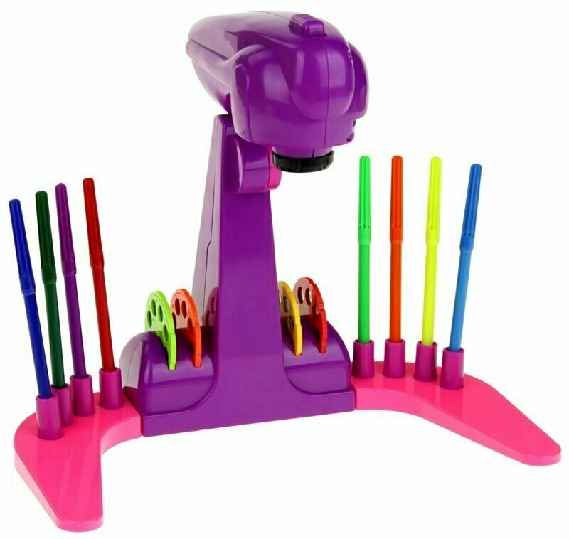Fioletowy projektor do rysowania z zestawem różnych slajdów. Wystarczy, że ustawimy kartkę pod rzutnikiem oraz zamontujemy wybrany obrazek. Wówczas wyświetli się on na kartce i ułatwi rysowanie, ponieważ dziecko ma zarysowane kontury i kolory danej grafiki. Dostępne są aż 32 wzory (zwierzątka, rośliny, owoce, obiekty). Na podstawce projektora znajdują się otwory na kolorowe pisaki (dołączono). Książeczka poinstruuje nas, jak posługiwać się całym kompletem. Dzięki temu, że wysokość rzutnika jest regulowana, możemy sami decydować o wielkości danego obrazka.Baterie: 3xAA (brak w zestawie)Wymiary opakowania: 39x9x24cmWiek: 3+