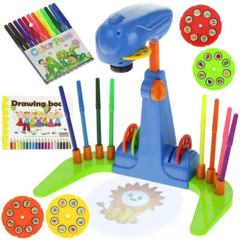 Niebieski projektor do rysowania z zestawem różnych slajdów. Wystarczy, że ustawimy kartkę pod rzutnikiem oraz zamontujemy wybrany obrazek. Wówczas wyświetli się on na kartce i ułatwi rysowanie, ponieważ dziecko ma zarysowane kontury i kolory danej grafiki. Dostępne są aż 32 wzory (zwierzątka, rośliny, owoce, obiekty). Na podstawce projektora znajdują się otwory na kolorowe pisaki (dołączono). Książeczka poinstruuje nas, jak posługiwać się całym kompletem. Dzięki temu, że wysokość rzutnika jest regulowana, możemy sami decydować o wielkości danego obrazka.Baterie: 3xAA (brak w zestawie)Wymiary opakowania: 39x9x24cmWiek: 3+