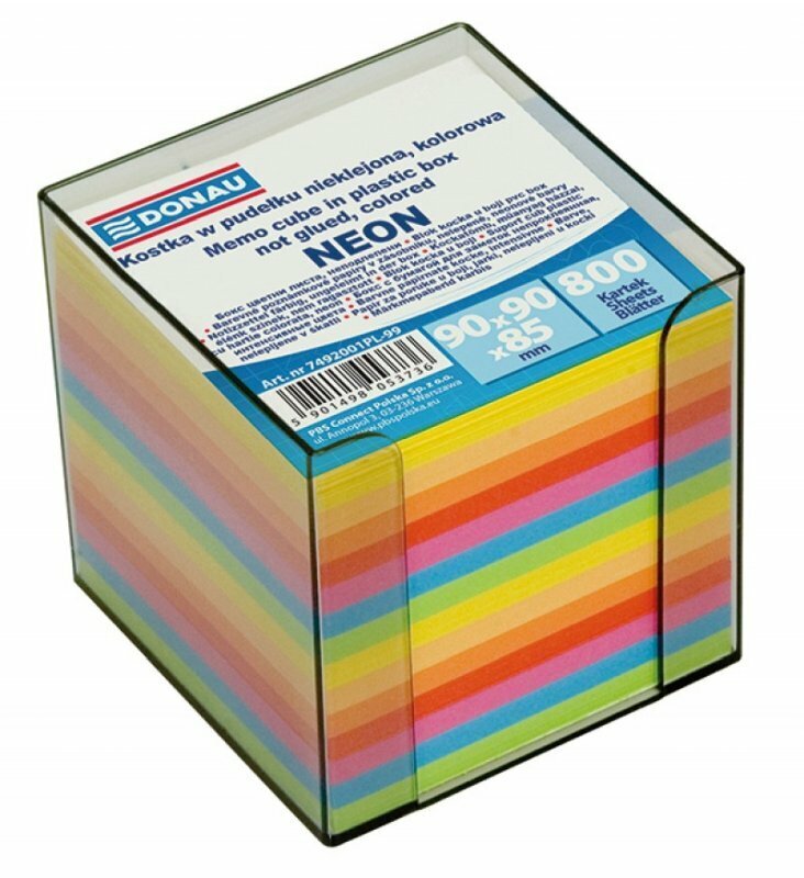 Kostka DONAU w pudełku nieklejona, kolorowa (800 kartek).Cechy produktu:- ekologiczna kostka w pojemniku, karteczki nieklejone,- rozmiar karteczki: 89x89mm,- wysokość kostki: 85mm,- ilość karteczek: 800 ± 10%,- gramatura karteczek: 70gsm,- wymiary zewnętrzne pojemnika: 95x95x95mm,- stabilny pojemnik wykonany z przezroczystego tworzywa,- foliowana jednostka sprzedaży,- mix kolorów neonowych.Wymiary opakowania: 9,5x9,5x9,5cm