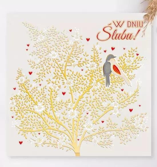 Karnet kwadratowy 15 x 15 cm. Złocony i tłoczony, teksy życzeń w środku. Wydrukowany na wysokiej jakości papierze. W zestawie koperta.