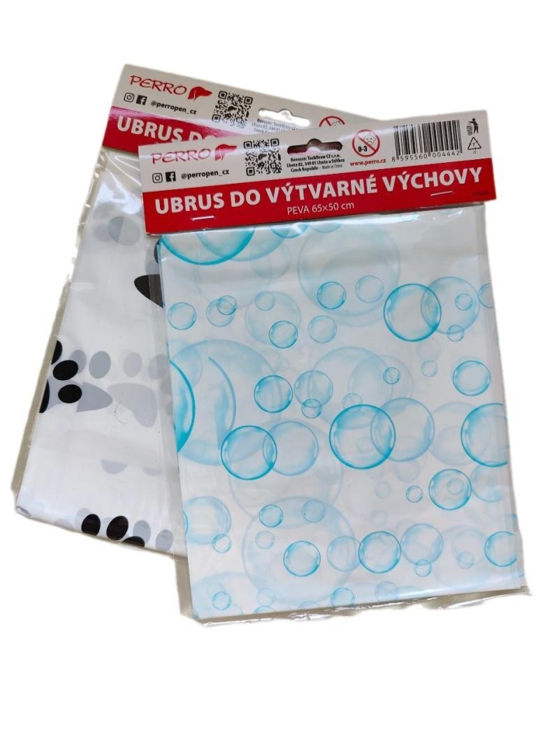 Tento ochranný ubrus je vyroben z kvalitního materiálu PEVA, který se snadno čistí a je odolný vůči vodě i nečistotám. Rozměr 65 x 50 cm poskytuje dostatečnou plochu pro efektivní ochranu většiny lavic a stolů. Ubrus je dostupný v mixu designů - můžete vybírat ze vzorů s černými tlapkami nebo modrými bublinkami, které dodají vašemu prostoru hravý a moderní vzhled.