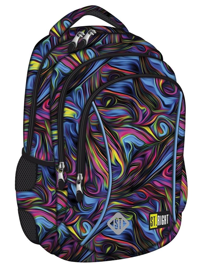 Pojemny i funkcjonalny plecak szkolny idealny dla ucznia klas 1-3 szkoły podstawowej. Plecak charakteryzuje bardzo staranne wykonanie oraz ciekawy wzór w kolorowe smugi. Wykonany jest z wodoodpornego i wytrzymałego materiału. Plecak jest bardzo pojemny, posiada 3 duże komory. W komorze głównej mała kieszonka zamykana na zamek. W komorze frontowej znajduje się praktyczny organizer z zawieszką na klucze pomoże zorganizować przestrzeń, utrzymać ład i porządek. Po bokach plecak posiada dwie otwarte kieszenie na butelkę wody lub bidon. Wszystkie suwaki zakończone są dużymi poręcznymi pullerami. Tył plecaka jest mocno usztywniony, ergonomiczny i pokryty oddychającym materiałem. Szelki są szerokie, miękko wyściełane z wygodną regulacją długości. Spód plecaka wzmocniony jest grubą pianką oraz gumowymi stopkami. U góry plecak ma wszyty miękko wyściełany, wzmocniony uchwyt do przenoszenia oraz posiada uchwyt do suwaka komory głównej, który pozwala na założenie zabezpieczenia kłódkowego bądź z szyfrowaniem TSA. W plecaku umieszczone są również liczne elementy odblaskowe.
