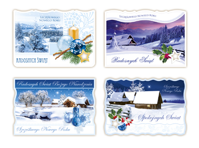 Pocztówki świąteczne z tekstem życzeńBrokat, ozdobny wykrojnik9 wzorów w opakowaniu 50 szt. mix číst celé