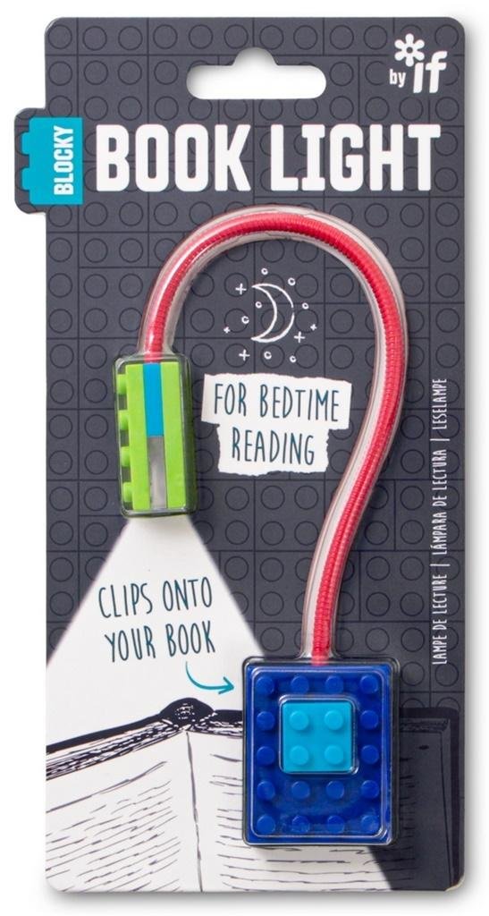 Lampka do książki z motywem klocków. Można ją przypiąć do książki, a dzięki elastycznemu ramieniu dowolnie skierować światło LED. W zestawie zawiera baterie 3x AG3 (LR41).