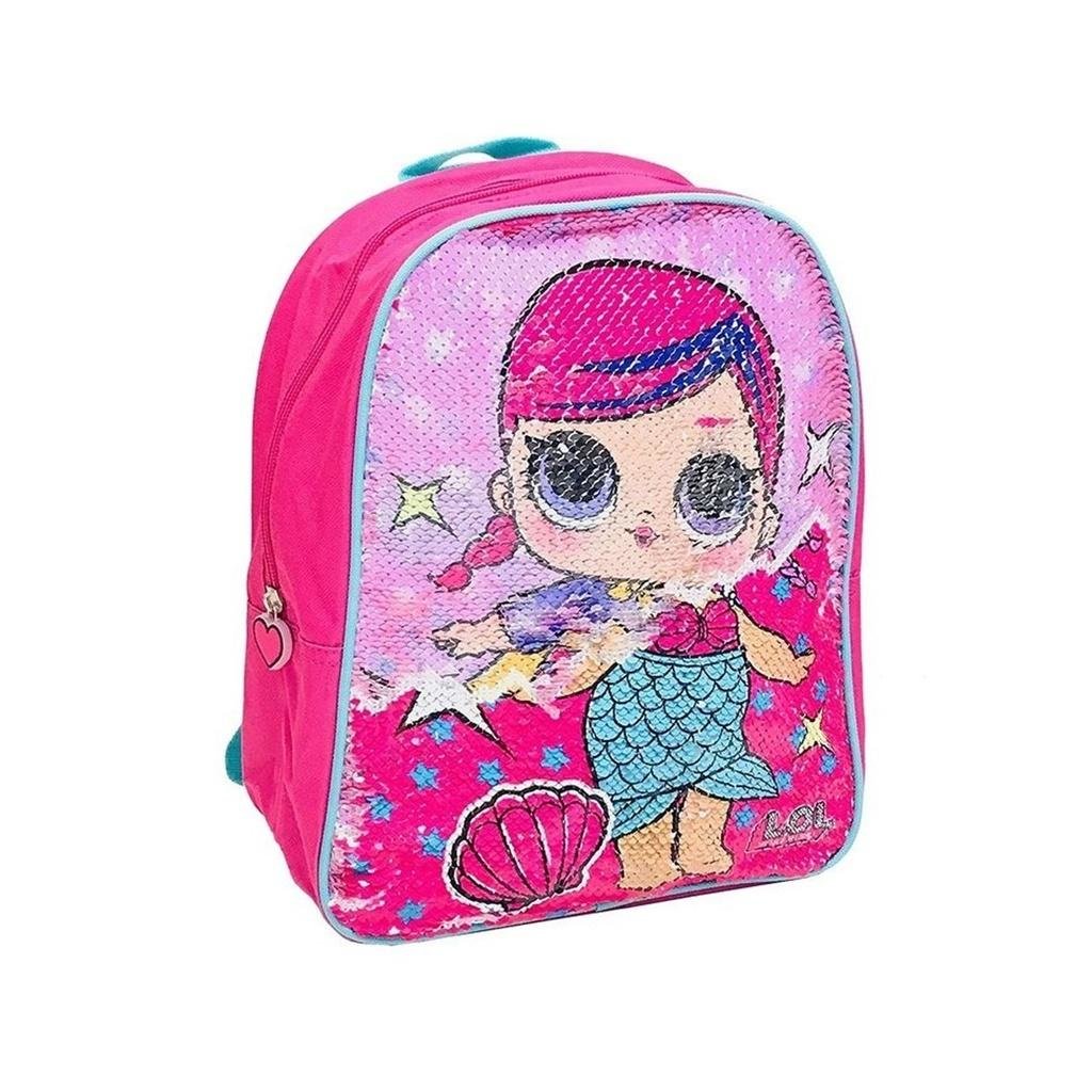 L.O.L Surprise, Plecak z cekinamiIdealny plecak do szkoły lub na wycieczkę.Przód ozdobiony dwustronnymi cekinami z wizerunkiem dziewczynek LOL Surprise.Plecak zapinany na suwak, jednokomorowy.Posiada usztywniane i regulowane szelki oraz usztywniony tył.Rozmiary plecaka: 36x30x10 cm