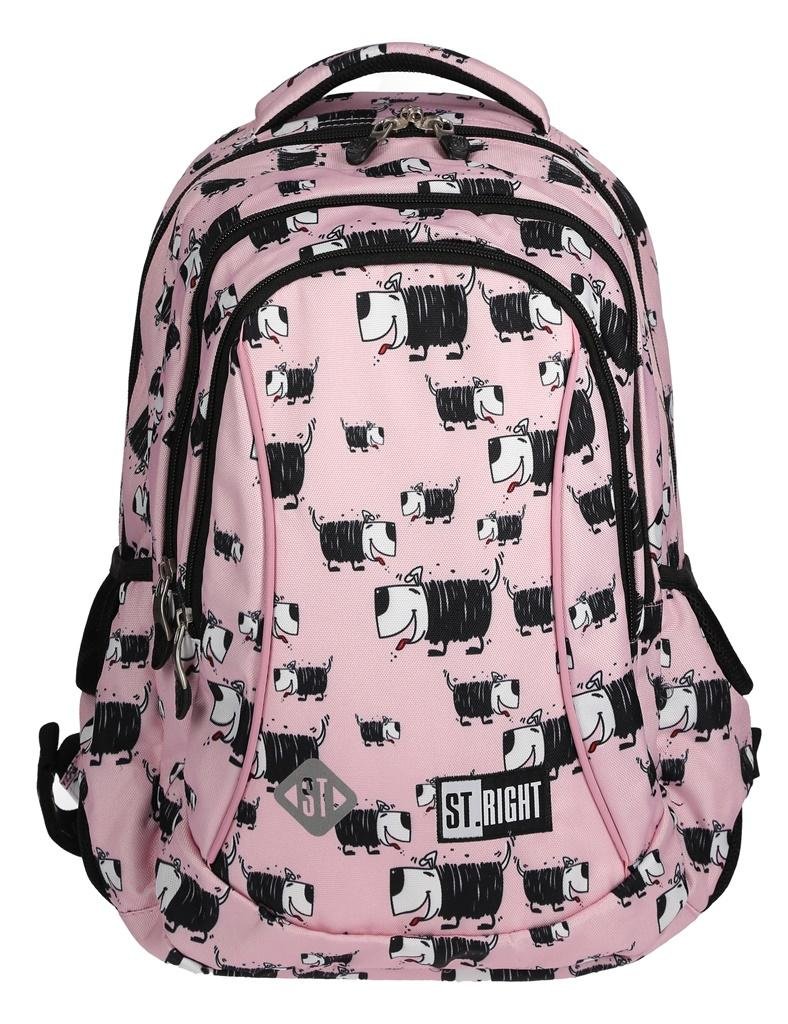 Pojemny i funkcjonalny plecak szkolny idealny dla ucznia klas 1-3 szkoły podstawowej. Plecak charakteryzuje bardzo staranne wykonanie oraz ciekawy wzór w zabawne pieski na pastelowym tle. Wykonany jest z wodoodpornego i wytrzymałego materiału. Plecak jest bardzo pojemny, posiada 3 duże komory. W komorze głównej mała kieszonka zamykana na zamek. W komorze frontowej znajduje się praktyczny organizer z zawieszką na klucze pomoże zorganizować przestrzeń, utrzymać ład i porządek. Po bokach plecak posiada dwie otwarte kieszenie na butelkę wody lub bidon. Wszystkie suwaki zakończone są dużymi poręcznymi pullerami. Tył plecaka jest mocno usztywniony, ergonomiczny i pokryty oddychającym materiałem. Szelki są szerokie, miękko wyściełane z wygodną regulacją długości. Spód plecaka wzmocniony jest grubą pianką oraz gumowymi stopkami. U góry plecak ma wszyty miękko wyściełany, wzmocniony uchwyt do przenoszenia oraz posiada uchwyt do suwaka komory głównej, który pozwala na założenie zabezpieczenia kłódkowego bądź z szyfrowaniem TSA. W plecaku umieszczone są również liczne elementy odblaskowe.
