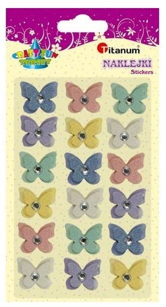 Naklejki papierowe 3D motyle 25x22mm mix kolorów z brokatem białe, żółte, różowe, miętowe, fioletowe, niebieskie 18szt.