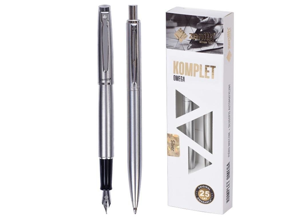 Eleganckie metalowe pióro wieczne i metalowy długopis Silver. Stalówka zakończona irydową kulką dla zapewnienia doskonałej jakości i łatwości pisania. Wymienne naboje atramentowe. Wymienny wkład wielkopojemny Zenith 4 z dokumentalnym tuszem w kolorze niebieskim gwarantującym trwałość zapisu. Długość linii pisania 4500 metrów. Kolory: srebrny