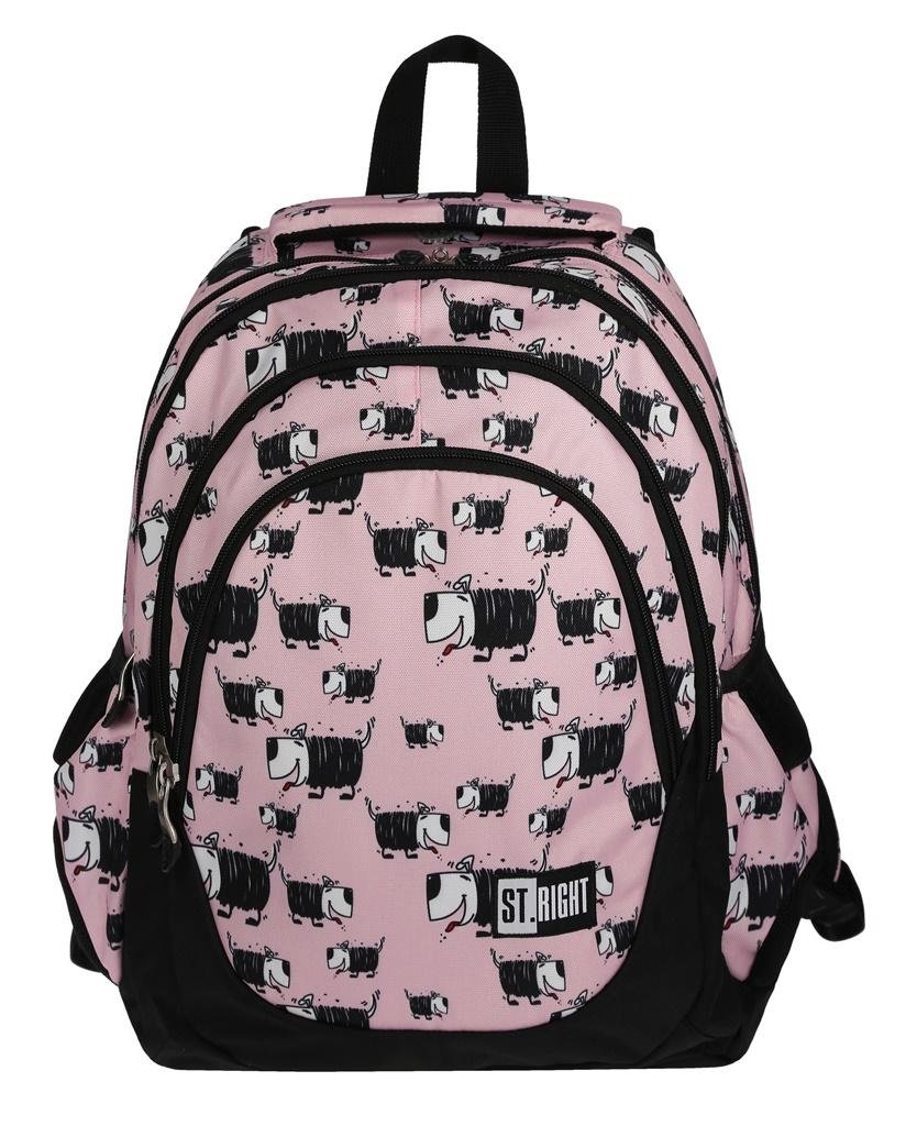 Pojemny i funkcjonalny plecak szkolny dla dziewczynki. Plecak charakteryzuje bardzo staranne wykonanie oraz piękny wzór w zabawne pieski na pastelowym tle. Materiał z którego plecak uszyto jest wodoodporny i wytrzymały. Plecak jest niezwykle pojemny, posiada 4 duże komory. W jednej z komór znajduję się duża zakładka na format A4 oraz wyściełana kieszeń na smartfona; druga pojemna komora również swobodnie mieści format A4; w trzeciej komorze znajduje się duża kieszeń zamykana na zamek, w czwartej komorze znajduje się organizer na długopisy, dwie kieszenie (w tym jedna na zamek) oraz karabińczyk z brelokiem na klucze. Frontowa komora jest wzmocniona od zewnątrz pianką, chroniąc zawartość przed ewentualnym uszkodzeniem. Po bokach plecak posiada dwie kieszenie na butelkę wody lub bidon. Dwukierunkowe suwaki dają możliwość szybkiego, wygodnego otwierania. Wszystkie suwaki zakończone są dużymi poręcznymi pullerami. Tył plecaka jest mocno usztywniony, ergonomiczny i pokryty oddychającym materiałem. Szelki są szerokie, miękko wyściełane pokryte od spodu oddychającym materiałem. Spód plecaka wzmocniony jest grubą pianką. U góry plecak ma wszyty miękko wyściełany, wzmocniony uchwyt do przenoszenia oraz wyjście na słuchawki. Dodatkowo posiada uchwyt do suwaka głównej komory pozwalające na założenie zabezpieczenia kłódkowego lub z szyfrowaniem TSA.