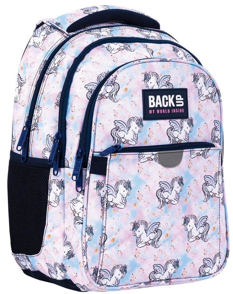 Zaczarowany pegaz, czyli bajkowy rumak ze skrzydłami stał się w ostatnich latach niekwestionowanym ulubieńcem wszystkich dziewczyn. Stanowił on inspirację do stworzenia tej kolekcji plecaków. W tym wydaniu pojawił się na tle niebieskiego nieba z bajecznymi różowymi chmurami, które kojarzą się ze słodką watą cukrową. Dodatkowo uzupełniony złotym pyłem. Dzięki temu zyskuje on magiczny efekt rodem z zaczarowanej krainy baśni. Komfortowy kształ oraz wyjątkowy wzór sprawią, że plecak BackUP doda magii każdego dnia.