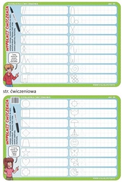 o edukacyjna podkładka ćwiczeniowa Visual Systemo do samodzielnych ćwiczeń o wypełniać cienkim mazakiem lub markerem do tablic suchościeralnycho treść można zmazać papierową chusteczką o dwustronnie foliowanao drukowana na kredzie 350 g