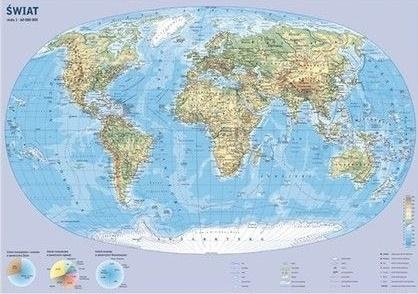 Świat mapa ścienna w skali 1:60 000 000 fizyczno-polityczna. Przejrzystemu obrazowi ukształtowania lądów i oceanów towarzyszą takie elementy treści jak: główna sieć rzeczna i najważniejsze jeziora, opisy ważniejszych krain geograficznych, wysp, półwyspów, mórz, basenów i grzbietów oceanicznych....
