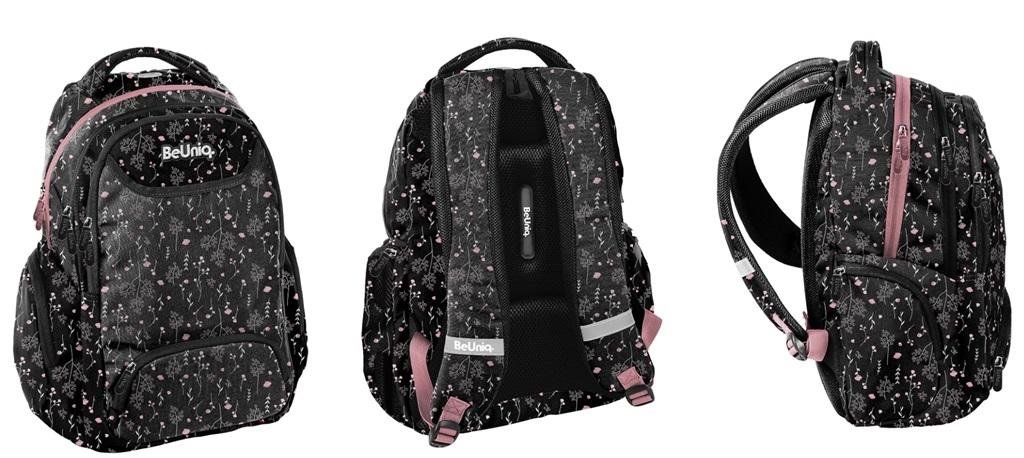 Plecak szkolny. Trzy pojemne komory, kieszeń przednia z organizerem, 2 boczne kieszenie z materiału zapinane na zamek z siatką w środku na napje. Wzmocnione profilowane plecy, miękkie wygodne szelki. Wzmocniony i usztywniony spód. Wygodny uchwyt do przenoszenia i uszko do powieszenia. W komorze głównej przegroda (na laptop), w trzeciej komorze organizer z kieszenią na zamek, uchwyt na klucze. Elementy odblaskowe dla większego bezpieczeństwa.