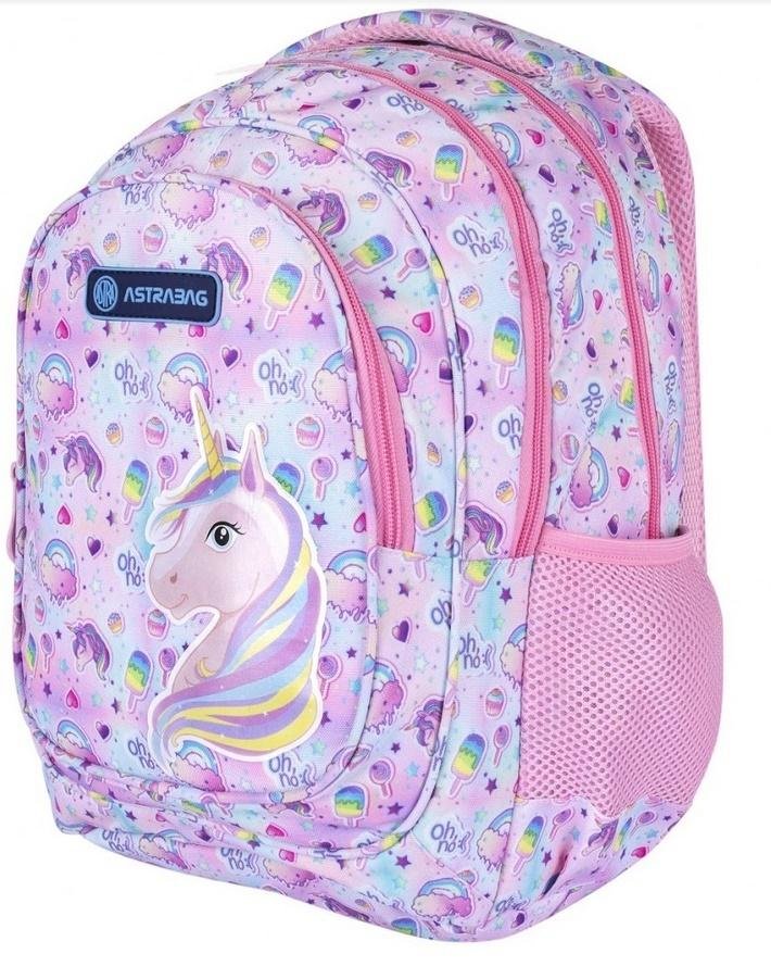 Poczuj się jak bohaterka swoich ulubionych kreskówek i stwórz własną historię z bajkowym plecakiem trzykomorowym Astrabag. Piękny pudrowy róż oraz pastelowy motyw jednorożców z całą pewnością skradnie serce niejednej dziewczynki zakochanej w tych baśniowych i mitycznych stworzeniach. Plecak szkolny cechuje się kompaktowymi wymiarami oraz niewielką wagą. Plecak szkolny Astrabag posiada trzy funkcjonalne komory wyposażone m.in. w praktyczną kieszonkę oraz organizer na drobiazgi. Zastosowano w nim najnowszą technologię Ergo Back minimalizującą naciski na barki i kręgosłup oraz zapewniającą poczucie komfortu dziecka. Dzięki niej ciężar na plecach rozkłada się równomiernie bez uciskania ramion.