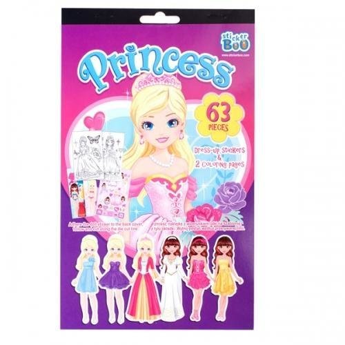 Naklejki dress-up z malowanką - 63 części. Zostań mistrzem stylizacji. Ubierz księżniczki w przepiękne sukienki. W zestawie 2 szablony, dwie strony do kolorowania i wiele kolorowych naklejek.