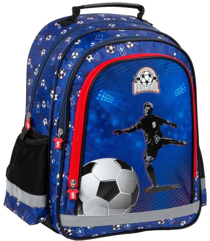 Dwukomorowy plecak szkolny z obszerną kieszenią przednią. Po bokach znajdują się dwie boczne kieszonki wykończone siatką. Plecak posiada miękkie wyściełane szelki, ergonomiczne plecy, taśmy odblaskowe, wzmacnianą rączkę oraz wzmacniane dno.