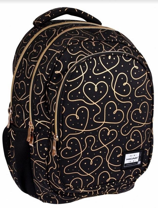 Trzykomorowy plecak Head został zaprojektowany z myślą o nastoletnich romantyczkach i romantykach. Designerskie złote serduszka na czarnym tle przypadną do gustu każdemu, kto ceni modne i ponadczasowe wzornictwo. Plecak Head posiada pojemne komory z przegródkami oraz praktycznym organizerem na drobiazgi. Zastosowano w nim technologię Ergo Back minimalizującą naciski na barki i kręgosłup. Dzięki niej ciężar na plecach dziecka rozkłada się równomiernie bez uciskania ramion.