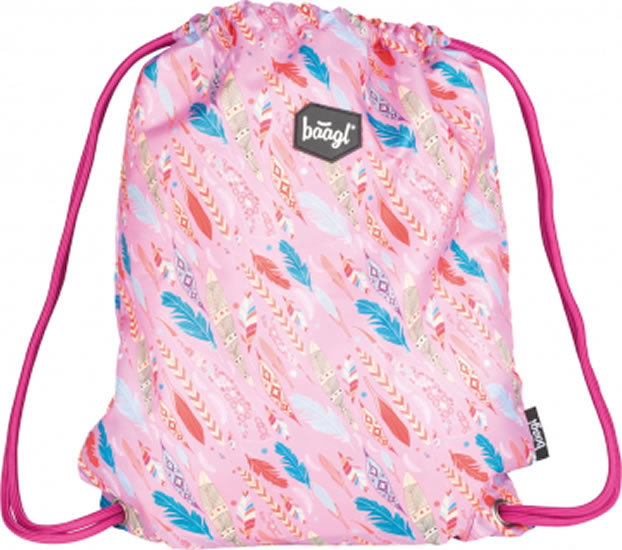 • Sáček na cvičky nebo přezůvky s motivem pírek z pevného omyvatelného materiálu • Zdrhování pomocí pevných tkanic, které zároveň umožňují nošení na zádech číst celé