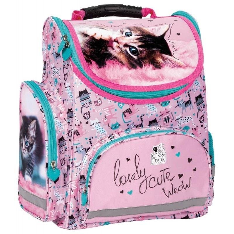 Polecamy lekki tornister szkolny z kotkami z nowej kolekcji DERFORM 2022. Doskonały tornister dla dziewczynki, która kocha koty. Tornister posiada komorę zamykaną na zamek, jest wyprofilowany i posiada niezbędne usztywnienie. Wykonany z wysokiej jakości materiałów i wyposażony w odblaski. Tornister posiada ozdobne zawieszki przy zamkach w kształcie serduszek.