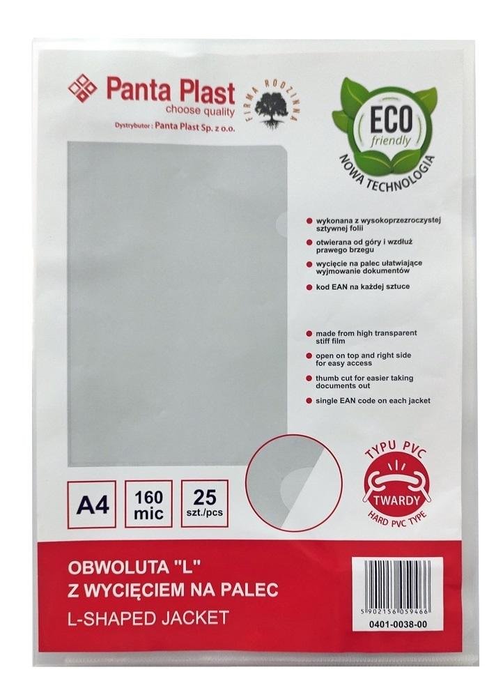 Sztywna folia typu PVC, otwierana od góry i wzdłuż prawego brzegu, wycięcie na palec ułatwia wyjmowanie dokumentów.